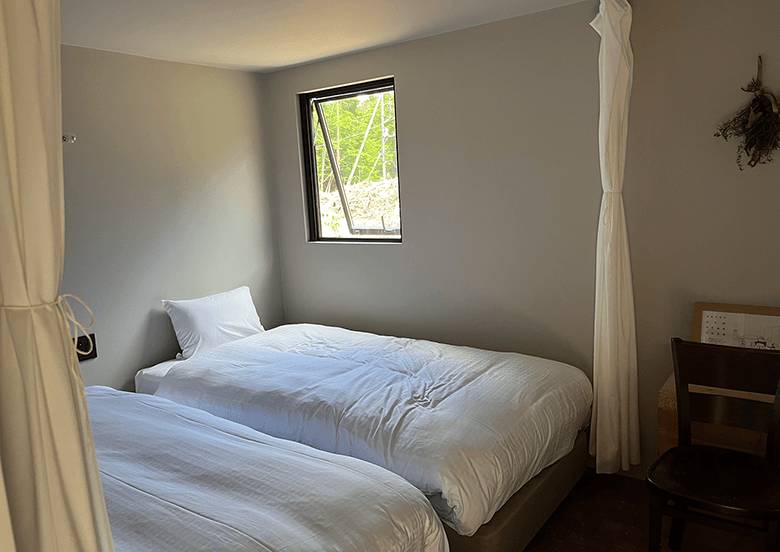 シングルベッド(2台)・小上がりに布団(2セット)・椅子・エアコン